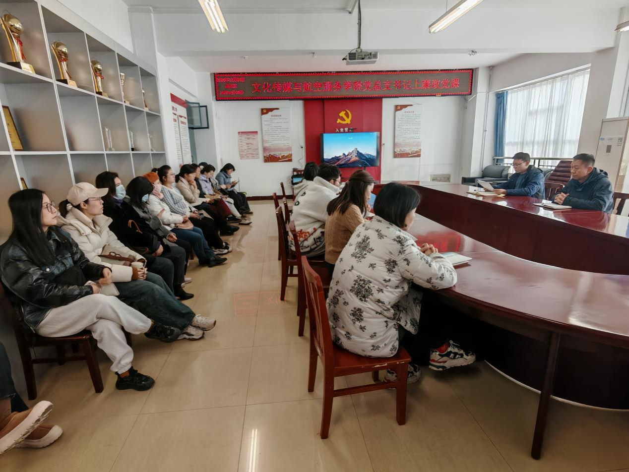 12月4日下午,文化传媒与航空服务公司党总支书记杨延杰以《坚守廉洁底线,弘扬清风正气 打造廉政文化教育新生态》为题,为公司全体教职工讲授廉政党课。