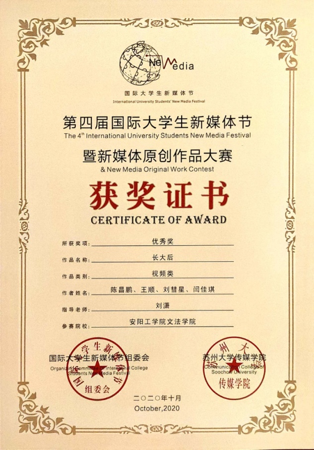 10月25日上午,由江苏省委宣传部、苏州市委宣传部指导,苏州大学主办的第四届国际老员工新媒体节暨新媒体原创作品大赛在苏州正式拉开帷幕。文法公司陈昌鹏、王顺、刘慧星、闫佳琪四名同学的团队作品《长大后》荣获优秀奖。