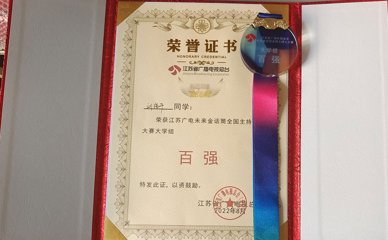 2022年8月,第九届江苏广电“未来金话筒”全国主持人大赛决赛落下帷幕,该赛事覆盖全国四百多所高校,本届大赛由来自全国各地的超过4100名选手参与。文化与传媒公司播音与主持艺术专业刘浩千同学在决赛中取得全国百强的好成绩。